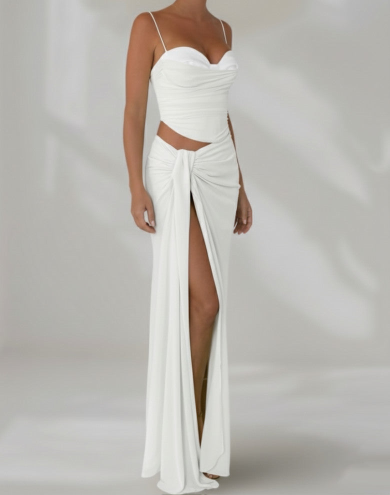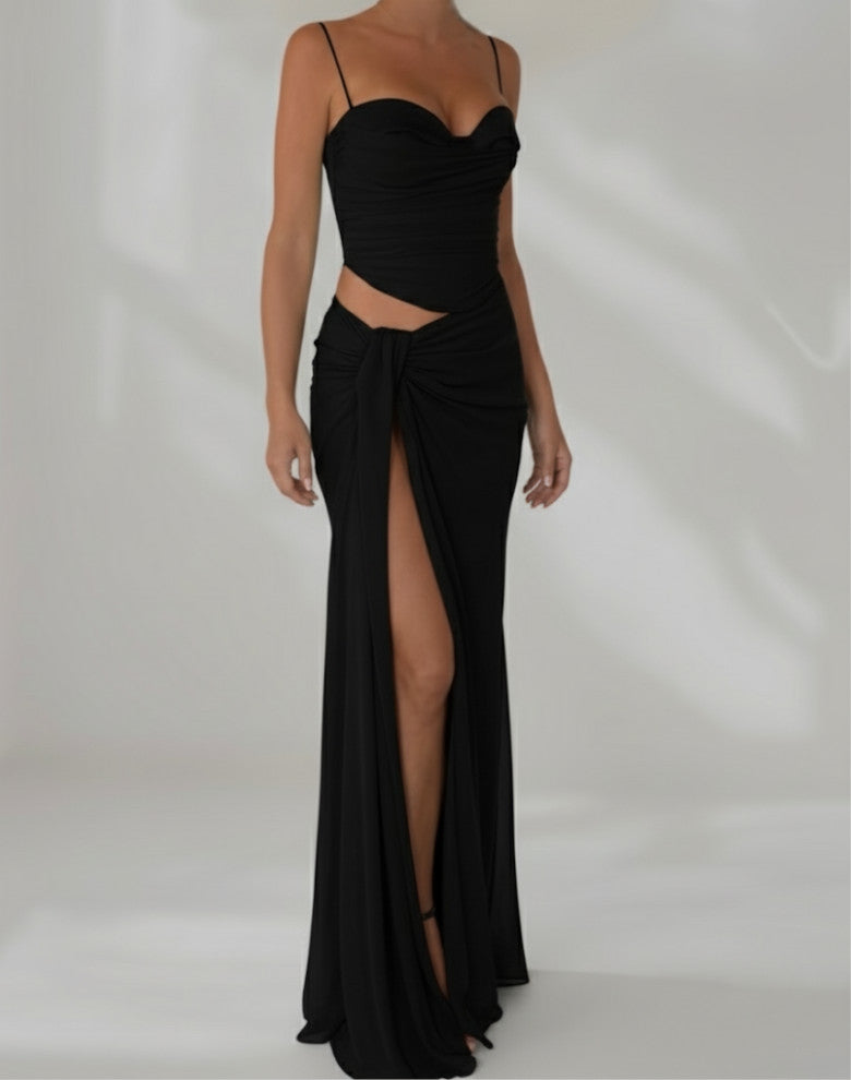 Two piece set with a beautiful corset featuring a sheer ruched front overlay paired with a stunning Georgette half lined gown maxi skirt with thigh split.