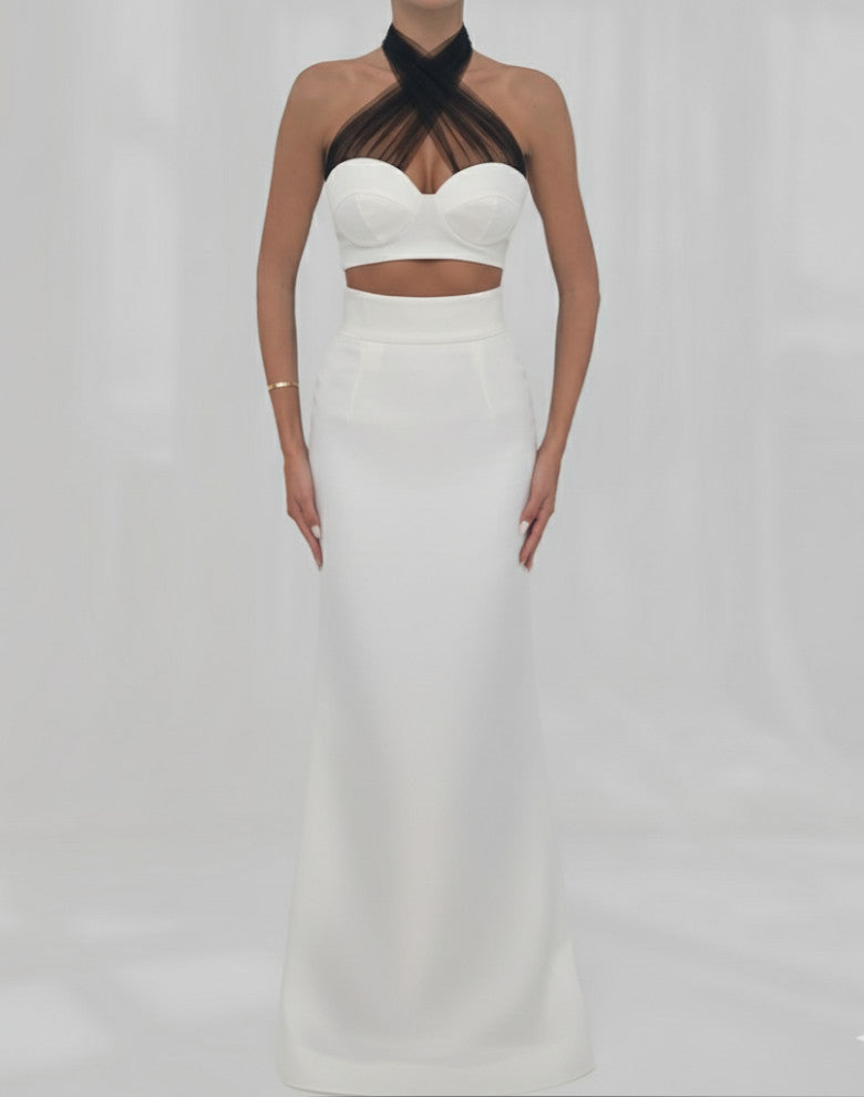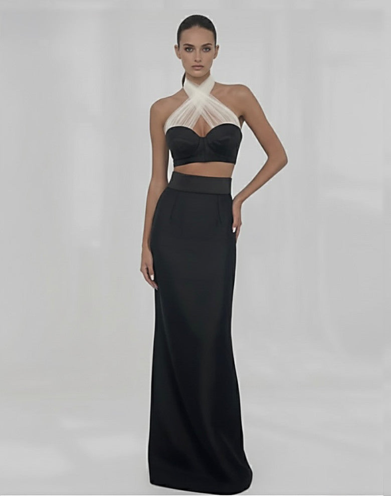 Stunning cropped corset bralette with ivory tulle neckline featuring a beautiful fitted gown maxi skirt.