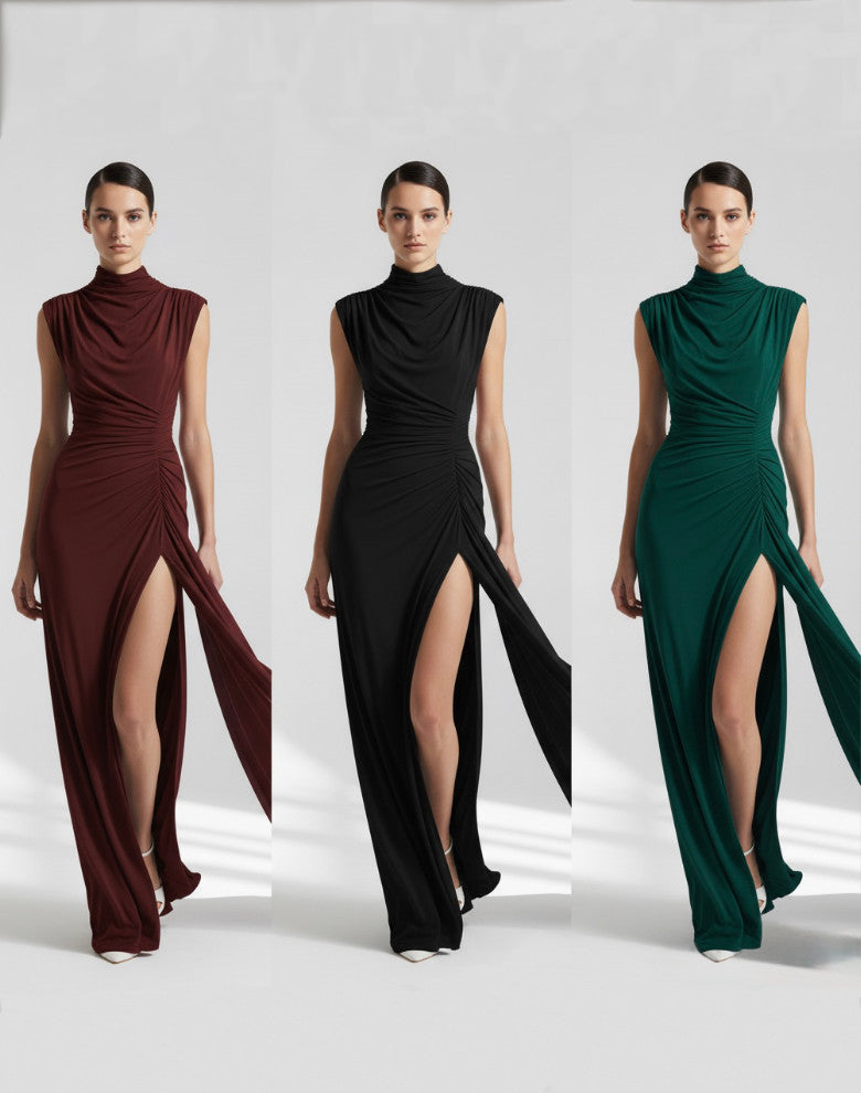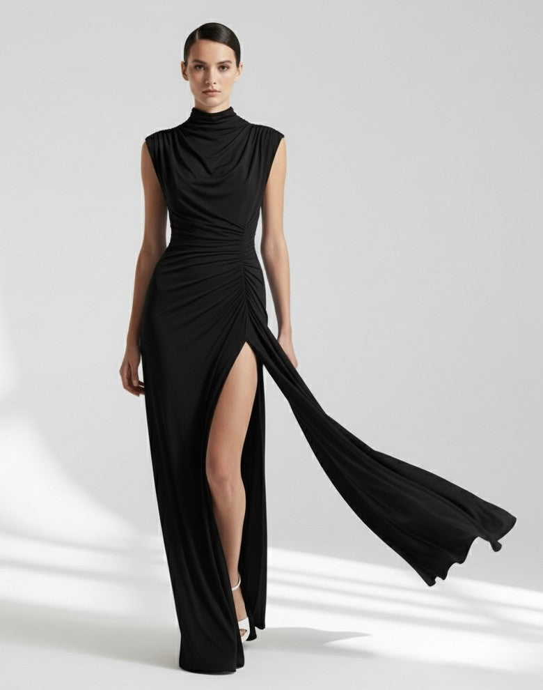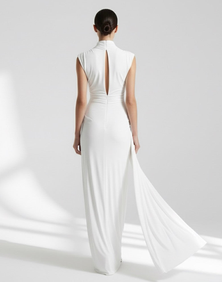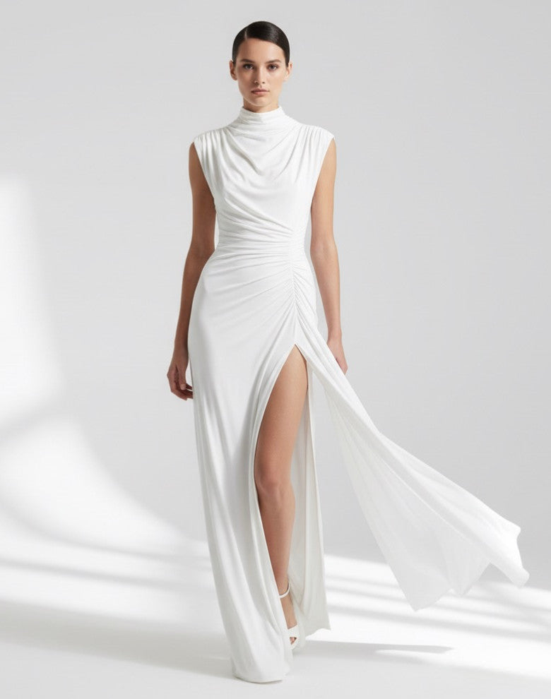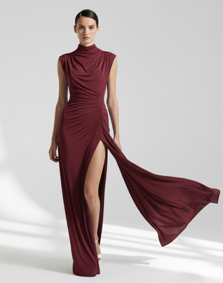 Stunning silky jersey high neck-floor length gown with ruched hip feature and open back slit.