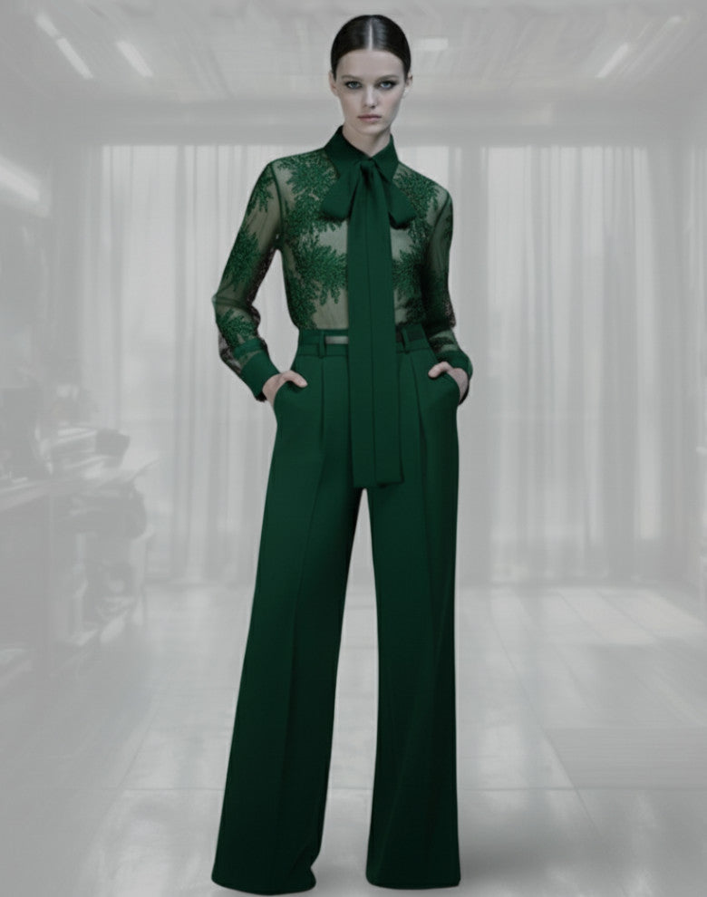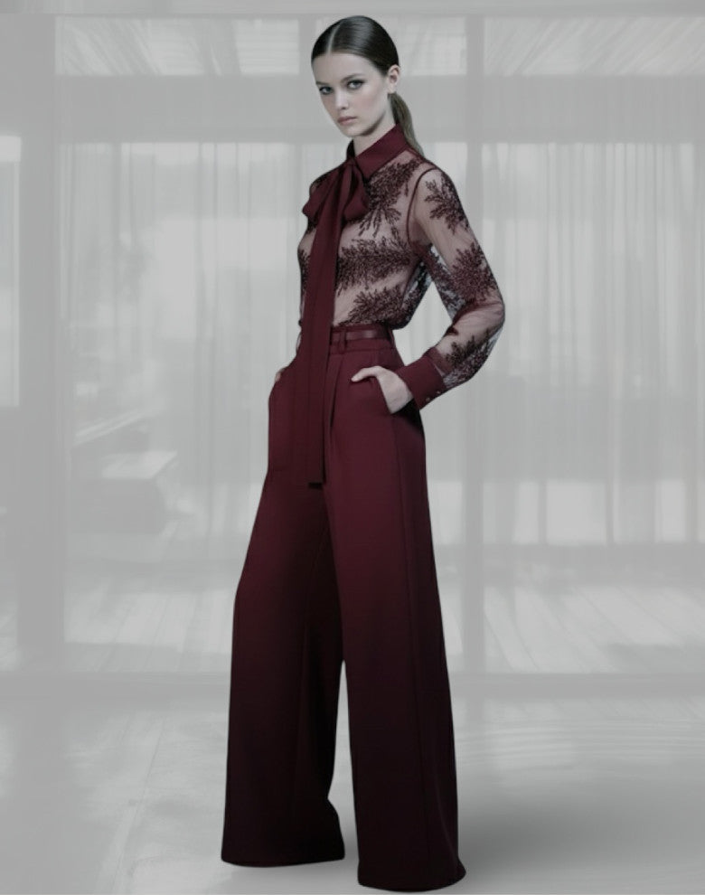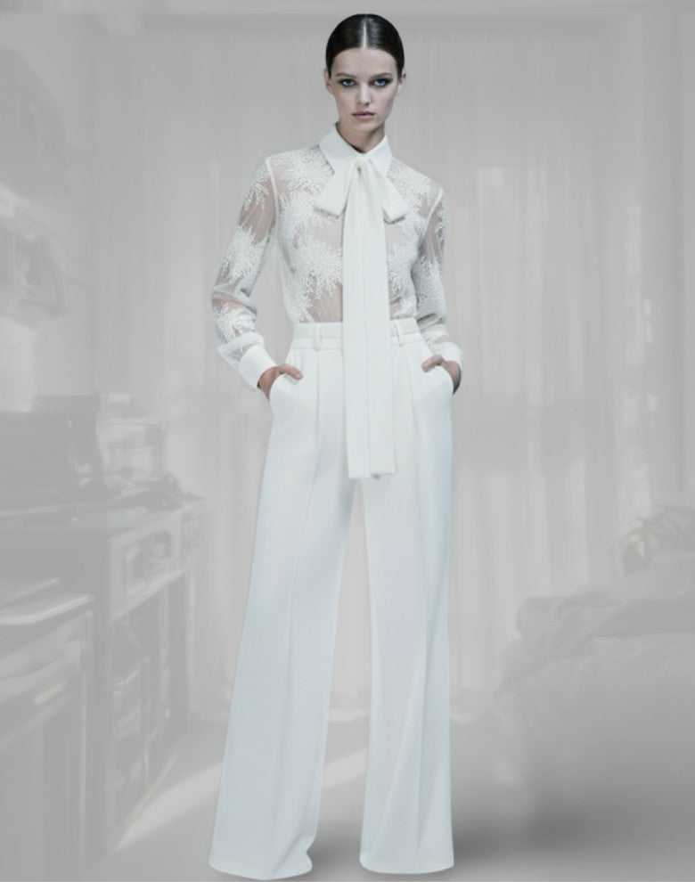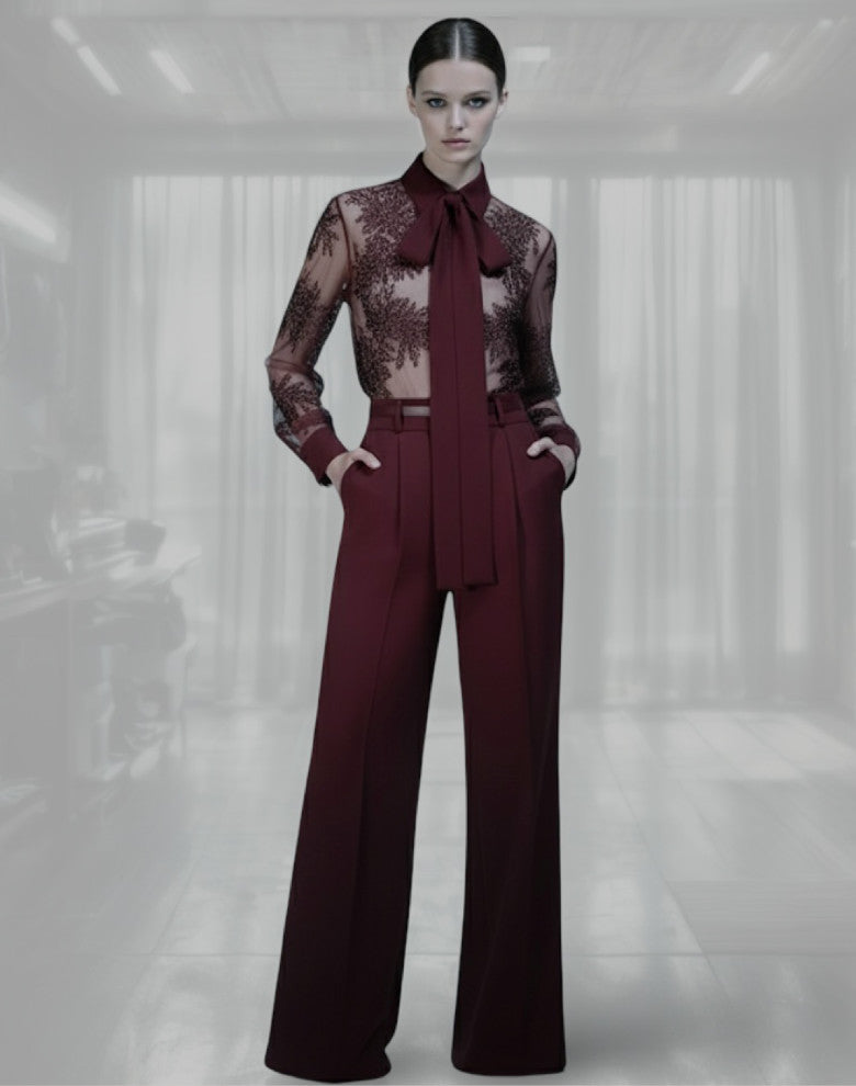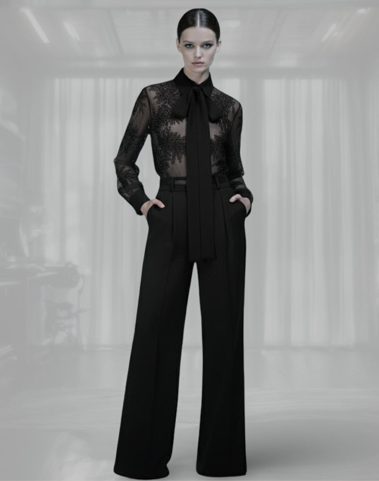 Super chic set featuring a lace tailored shirt with necktie and monochrome matching tailored pants.