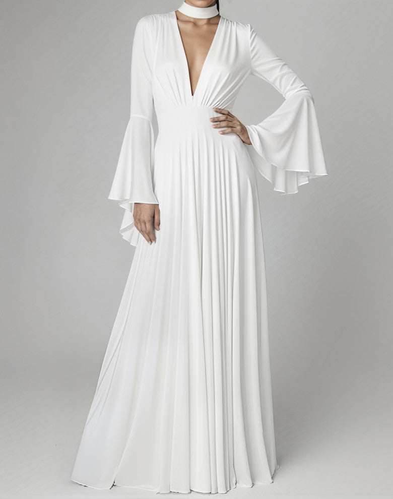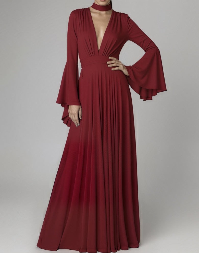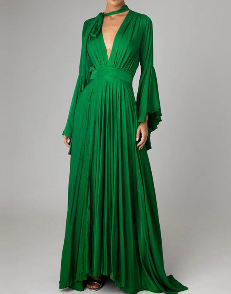 70s inspired chic maxi with neck tie and bias ruffles on sleeves.